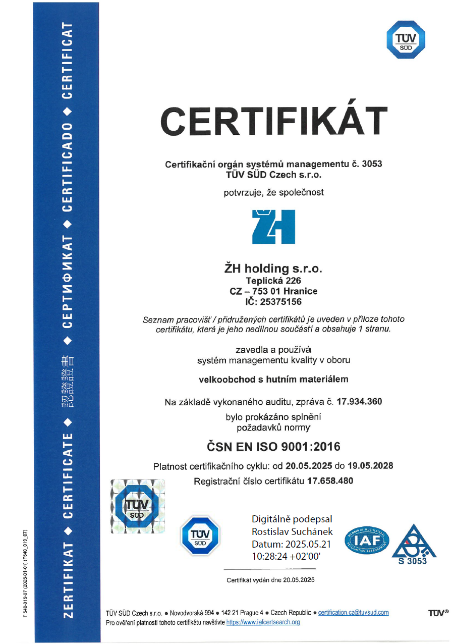 ŽH holding s.r.o. Teplická 226753 01 Hranice I-Město, CZIČ: 25375156 Reception +420.581698441 Secretariat +420.581698463 www.zh-holding.cz